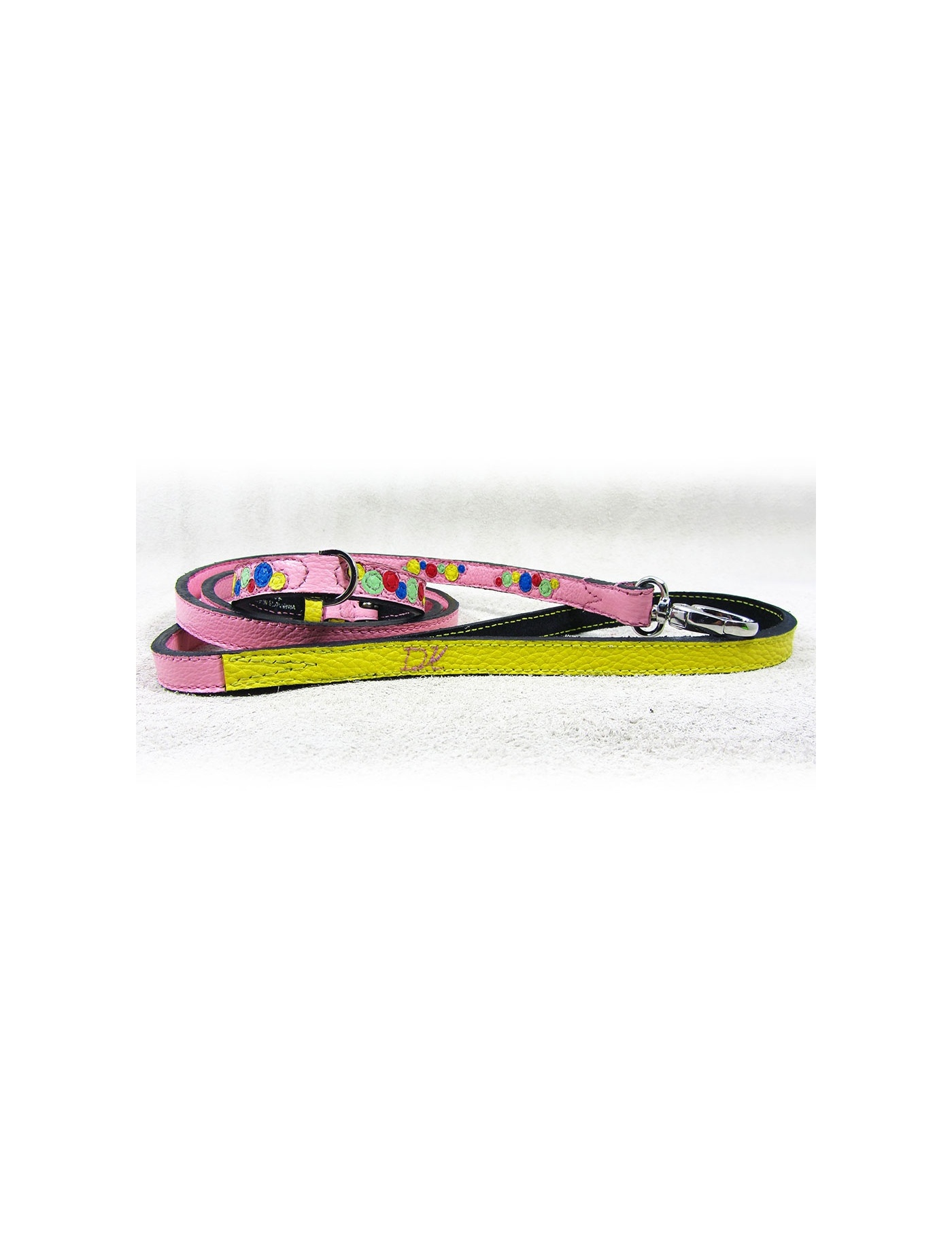 Unique set of leather dog leash and dog collar will keep you and your little dog into the world of color and joy. This unique dog leather package of dog collar and leash with the motives of colorful bubbles will be a unique gift for your small pup.